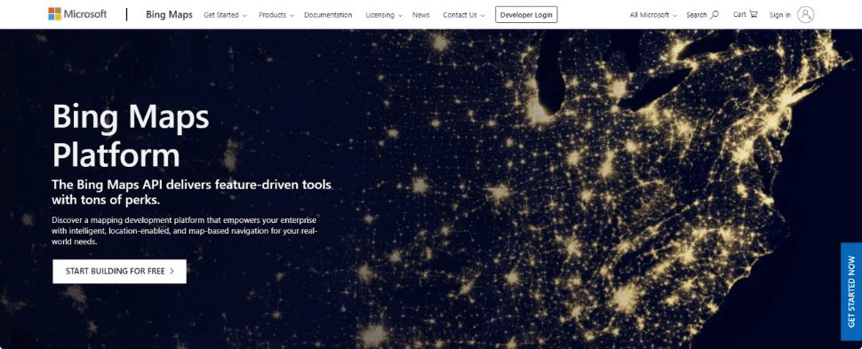The Bing Maps Platform by Microsoft allows enterprise-level developers to build map-based geospatial experiences using the Bing Maps API. On this platform, custom or standard data points can be added to provide users with specific geocoding features for millions of addresses in the United States.